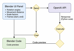 In diesem Projekt wurde ein Add-on für Blender entwickelt, das mithilfe der OpenAI-API (ChatGPT) natürliche Sprache in ausführbaren Python-Code übersetzt. So können Nutzer durch einfache Spracheingaben 3D-Objekte manipulieren und animieren, ohne sich tief in die Programmierschnittstellen von Blender einarbeiten zu müssen.