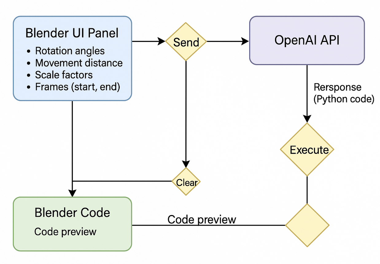In diesem Projekt wurde ein Add-on für Blender entwickelt, das mithilfe der OpenAI-API (ChatGPT) natürliche Sprache in ausführbaren Python-Code übersetzt. So können Nutzer durch einfache